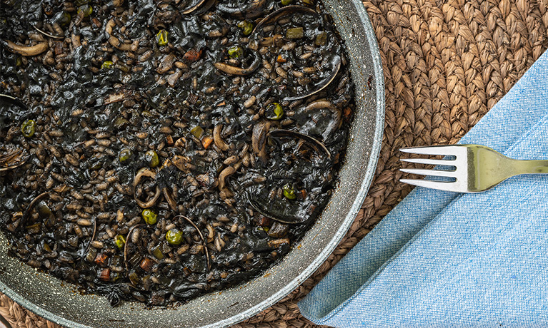 Wenn du mal eine ganz besondere Version der Meeresfrüchte-Paella auf den Tisch bringen willst, dann überrasch deine Mitesser doch mit arroz negro, dem „schwarzen Reis“. Wie der Name schon sagt, ist er von tiefdunkler Farbe, die einer ordentlichen Portion Tintenfischtinte zu verdanken ist. Als Einlage kommen neben klein geschnittenen Tintenfischen häufig auch Garnelen und grüner oder roter Paprika in die Pfanne. Das Ganze aromatisiert man gern mit einem guten Schuss Weißwein.