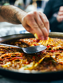 Interessanterweise sagen die Valencianos, dass eine Paella niemals gleich schmeckt wie die andere – selbst wenn sie mit den gleichen Zutaten zubereitet wird. Aber dass sie schmeckt, darin sind sich alle einig. Und natürlich mundet das spanische – pardon: das valencianische – Nationalgericht am besten, wenn man es in fröhlicher Runde genießt. Die fertige Paella wird einfach mitten auf den Esstisch gestellt. Dann isst man sie traditionell mit einem Holzlöffel direkt aus der Pfanne.