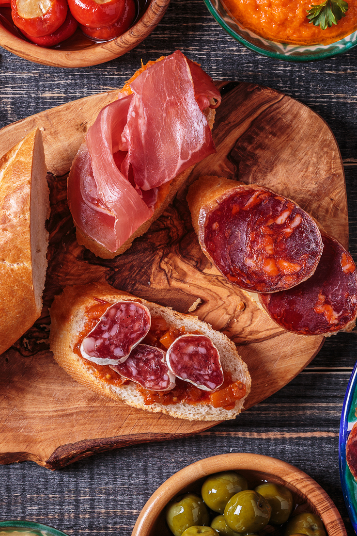 Pinchos sind die typischen Tapas des spanischen Nordens. Man findet sie vor allem im Baskenland, aber auch in Navarra, La Rioja, Asturien, Kantabrien und sogar im Norden Kastiliens. Was authentische Pinchos von den Tapas weiter südlich unterscheidet ist, dass sie meist wie eine Art Canapé daherkommen: Auf einer kleinen Scheibe Weißbrot türmen sich allerlei Leckereien – von Käse über Wurst oder Schinken bis hin zu den unterschiedlichsten Gemüsen, Fisch oder auch Meeresfrüchten. Damit das kulinarische Kunstwerk nicht zusammenbricht, wird die Kreation durch einen kleinen Holzspieß zusammengehalten. Deiner Fantasie sind bei Pinchos übrigens keine Grenzen gesetzt. Pack einfach auf deine Brotscheiben, was dir am besten schmeckt – und was außerdem noch hübsch aussieht.