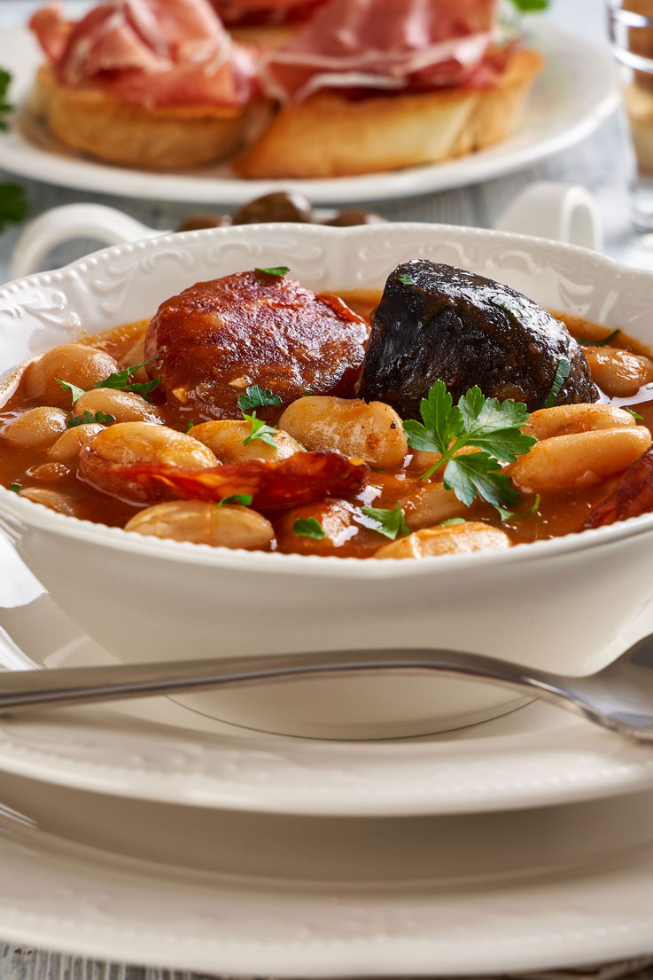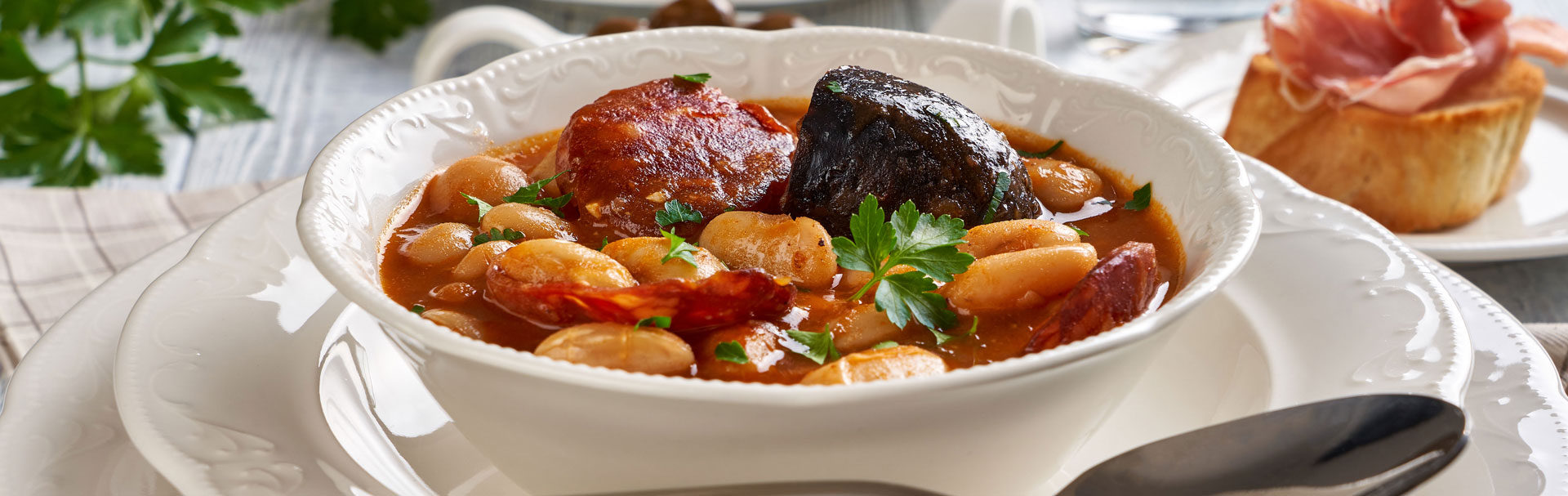 In den Bergen Nordspaniens braucht’s im Winter deftige Kost. Deshalb liebt man in der Region Asturien die fabada. Der deftige Bohneneintopf wärmt und macht satt, auch wenn eisige Winde um die Häuser fegen. Basis einer echten Fabada ist - wie der Name schon andeutet - die berühmte faba, eine große, flache weiße Bohne, die in Asturien in den Bergen und auch an der Atlantikküste angebaut wird. Sie zählt zu den edelsten spanischen Bohnensorten: mit feiner Haut, butterzart und sämig. In den Topf kommen außerdem Speck, Fleisch und Wurst, die bis heute im Winter auf vielen Höfen produziert werden. Auf keinen Fall fehlen darf auch Blutwurst (morcilla), die in Asturien meist leicht geräuchert wird. Traditionell serviert man die Fabada in flachen Steingutschalen und isst sie mit dem Holzlöffel.