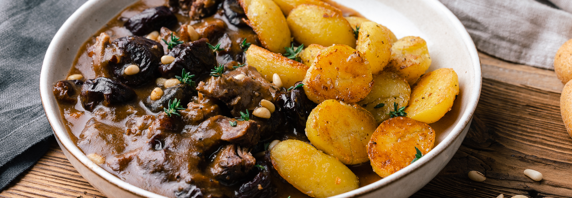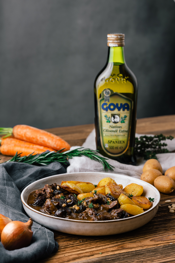 Ochsenschwanz ist in der spanischen Küche ein absoluter Klassiker. Vor allem in Gegenden, wo der Stierkampf eine lange Tradition hat, werden möglichst alle Teile des Tieres verwendet. Rabo de toro heißt ganz korrekt eigentlich „Stierschwanz“, aber du kannst für dieses leckere Gericht natürlich auch ganz normalen Ochsenschwanz verwenden. Wichtig ist, dass das Fleisch lange gegart wird. So ist es am Ende richtig schön zart und löst sich wie von selbst von den Knochen. Du kannst diese spanische Kombination aus Ochsenschwanz und Trockenfrüchten übrigens auch mal mit getrockneten Feigen, Aprikosen oder auch mit Rosinen probieren. Schmeckt ebenfalls fantastisch!