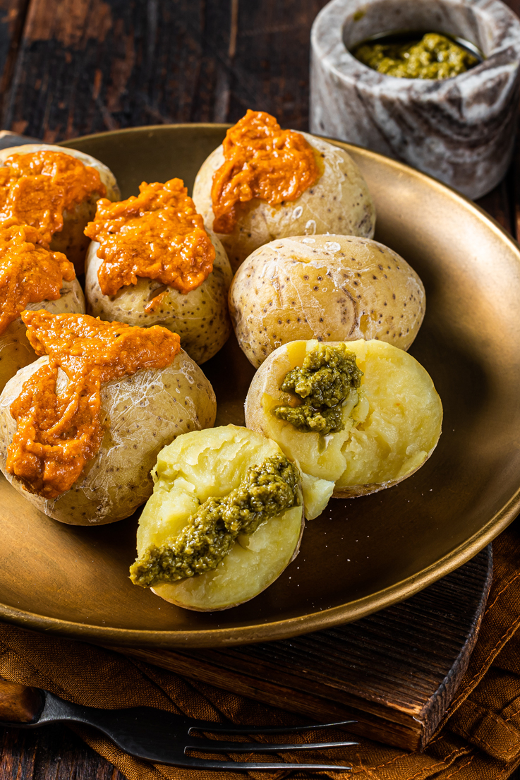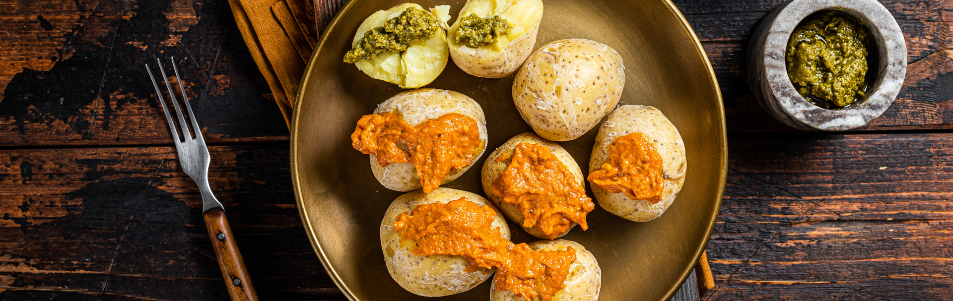 „Runzlige Kartoffeln“ (papas arrugadas) sind eine Spezialität der Kanarischen Inseln, und sie machen ihrem Namen alle Ehre. Früher hat man die Kartoffeln nämlich in Meerwasser so lange gekocht, bis alles Wasser verdampft war und verschrumpelte, salzverkrustete Knollen übriglieben. Heute kocht man die papas meist in Leitungswasser mit reichlich Meersalz. Serviert werden sie mit mojos. Das sind kalte Saucen auf Basis von Olivenöl und Essig. Dazu kommen für die rote Sauce (mojo rojo) roter Paprika und manchmal auch Chili (dann heißt sie mojo picón). Die grüne Sauce (mojo verde) macht man aus Koriander und/oder Petersilie. Papas arrugadas con mojo sind eigentlich eine typische Beilage zu Fleisch- oder Fischgerichten. Häufig werden sie aber auch als Tapa serviert. Einfach die Kartoffeln samt Schale in die Saucen tunken. Schmeckt köstlich!