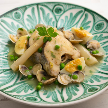 Seehecht mit Venusmuscheln, Erbsen und Spargel